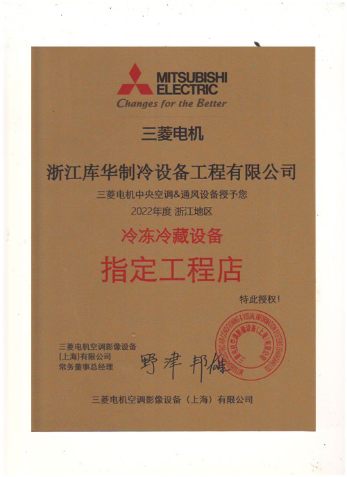 2022年度三菱電機冷凍機指定工程店--庫華制冷
